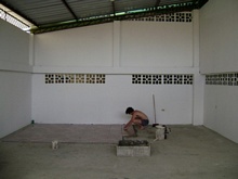 La parte posterior Nick colocando las baldosas Los últimos retoques La entrada del aula con Enrica, Michele Inés y Sofía (de izquierda a derecha) En el interior se preparan las ventanas